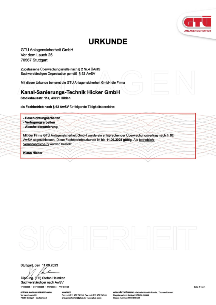 Die GTÜ Anlagensicherheit GmbH hat uns für die Tätigkeit als Fachbetrieb nach dem Wasserhaushaltsgesetz zertifiziert und somit einen Überwachungsvertrag abgeschlossen. Durch diesen Überwachungsvertrag unterliegt unser Unternehmen regelmäßigen Überprüfungen durch die GTÜ Anlagensicherheit GmbH, wodurch ordnungsgemäße Arbeitsabläufe sichergestellt werden.